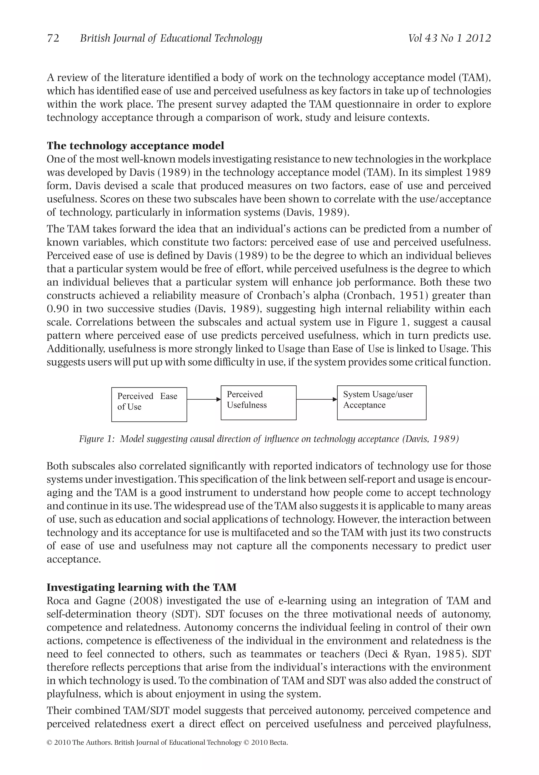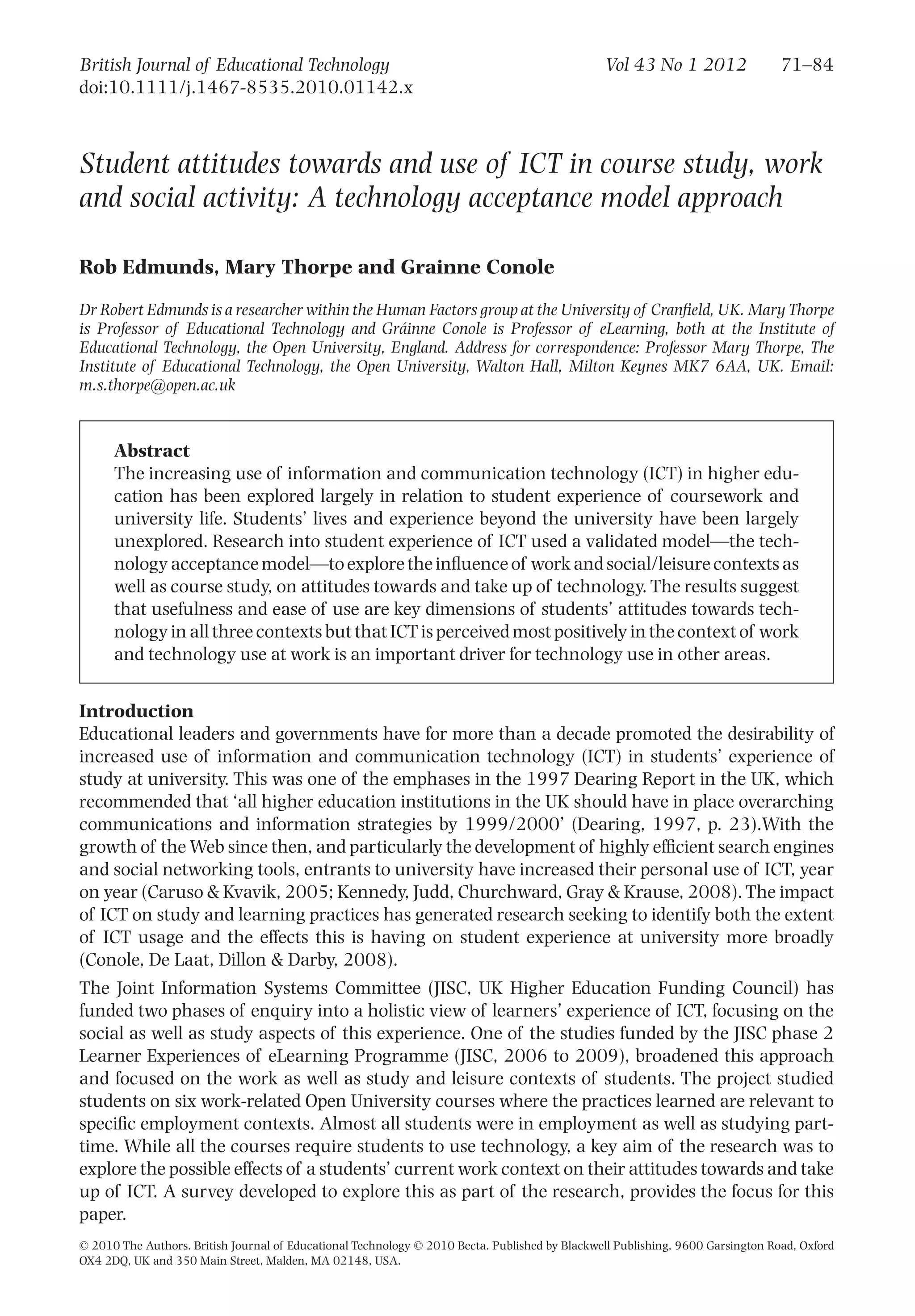 This document summarizes a study that examined student attitudes towards and use of information and communication technology (ICT) in the contexts of course study, work, and social/leisure activities. The study used the technology acceptance model (TAM) as a framework to understand how perceptions of usefulness and ease of use influence technology adoption. Surveys were administered to students in six different courses. Factor analysis revealed that usefulness and ease of use were key dimensions for ICT attitudes across all three contexts, but that ICT was perceived most positively in the work context, and technology use at work was an important driver for technology use in other areas.