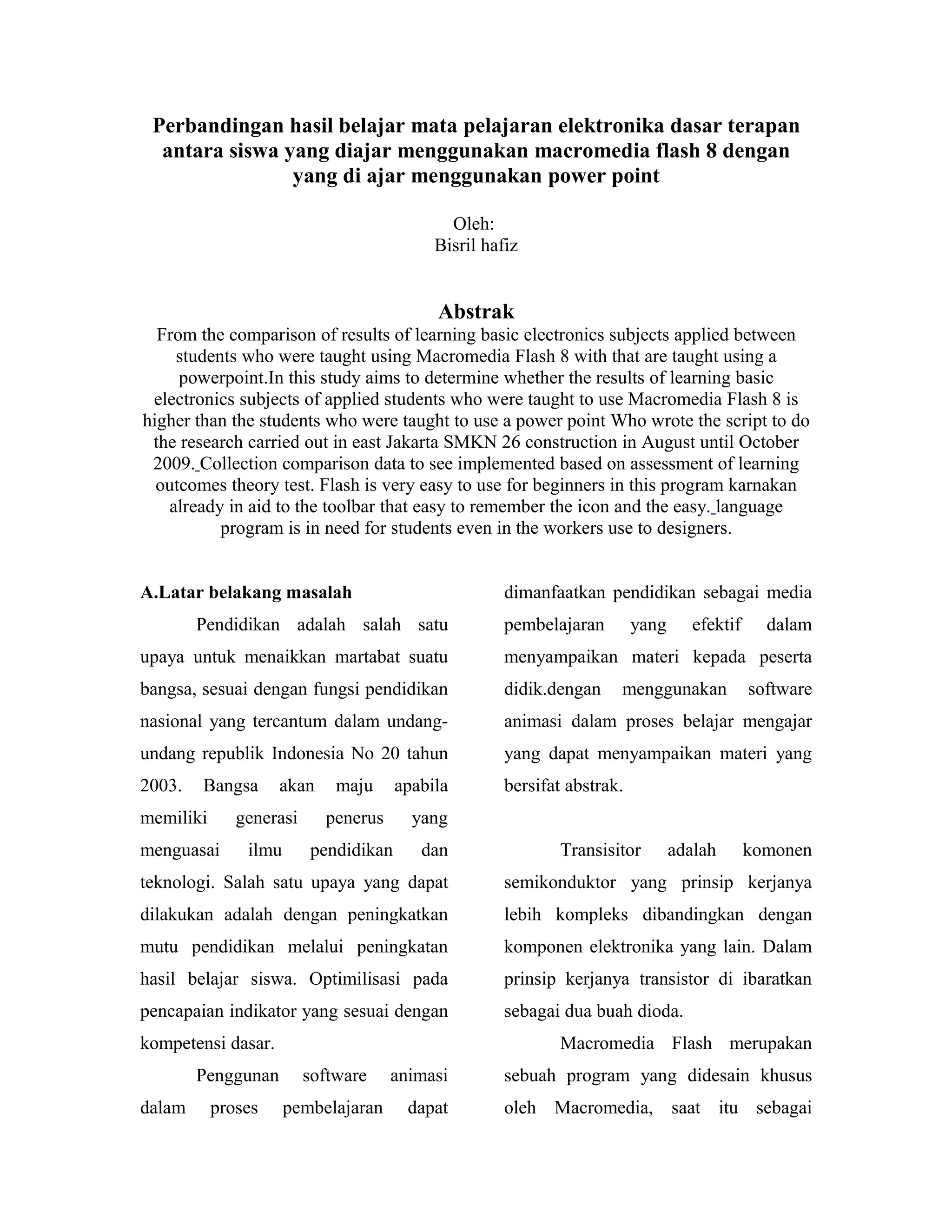 Penelitian ini membandingkan hasil belajar siswa pada mata pelajaran elektronika dasar terapan antara yang diajar menggunakan Macromedia Flash 8 dan PowerPoint. Hasil menunjukkan bahwa siswa yang diajar dengan Macromedia Flash 8 memiliki hasil belajar yang lebih baik. Penelitian ini dilakukan di SMKN 26 Jakarta dan menggunakan metode kuantitatif dengan analisis data yang meliputi uji normalitas dan homogenitas.