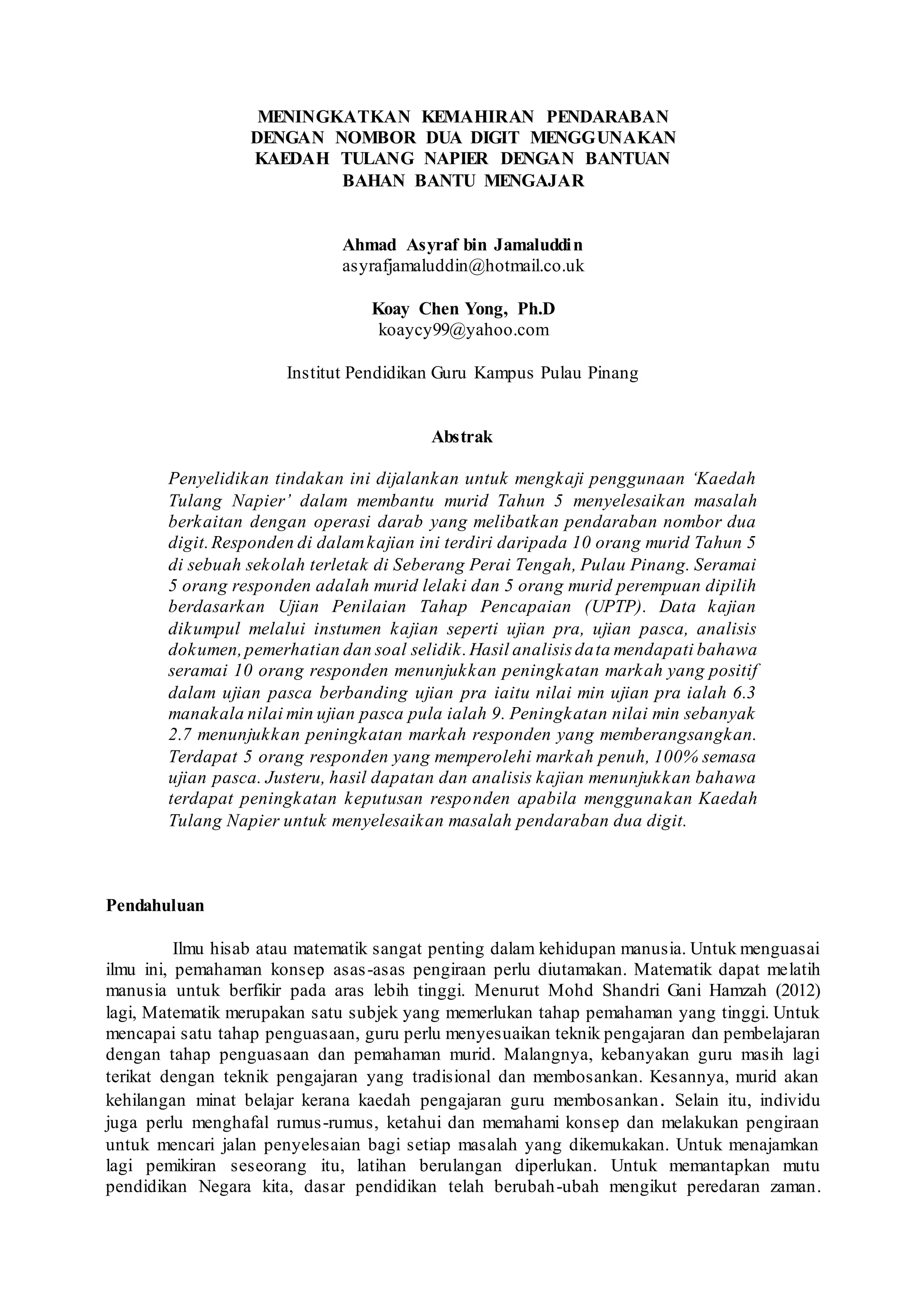 Kajian ini mengkaji keberkesanan kaedah tulang Napier dalam meningkatkan kemahiran pendaraban nombor dua digit di kalangan 10 murid tahun 5. Hasil analisis menunjukkan peningkatan yang signifikan dalam markah ujian pasca berbanding ujian pra, dengan nilai min meningkat daripada 6.3 kepada 9. Kaedah ini juga berjaya menarik minat murid dan memudahkan pemahaman mereka terhadap konsep pendaraban.