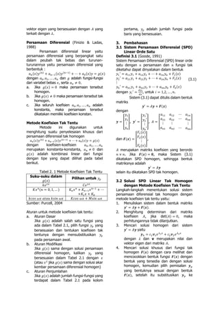 Skripsi ini membahas solusi sistem persamaan diferensial linear tak homogen dengan metode koefisien tak tentu. Metode ini digunakan untuk menentukan solusi khusus dari sistem persamaan diferensial tak homogen dengan menentukan fungsi pemisalan yang sesuai dengan bentuk fungsi tak homogen, lalu menghitung koefisiennya. Langkah-langkahnya adalah menuliskan sistem dalam bentuk matriks, mencari solusi homogen, memilih fungsi pemisalan sesuai bentuk
