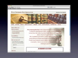 The document discusses the problem of mass incarceration in the United States, with the highest incarceration rate and total prison population in the world. It notes that over 7 million Americans were in the criminal justice system in 2008, with 1 in every 31 adults and 1 in 9 black men aged 20-34 incarcerated or on probation/parole. It then discusses an example of "Driving While Black" where a Canadian author was wrongly convicted for failure to comply with police orders, showing a lack of jury nullification. Finally, it promotes increasing awareness of jury nullification through organizations like Fully Informed Jury Association to give jurors more power to refuse unjust prosecutions.