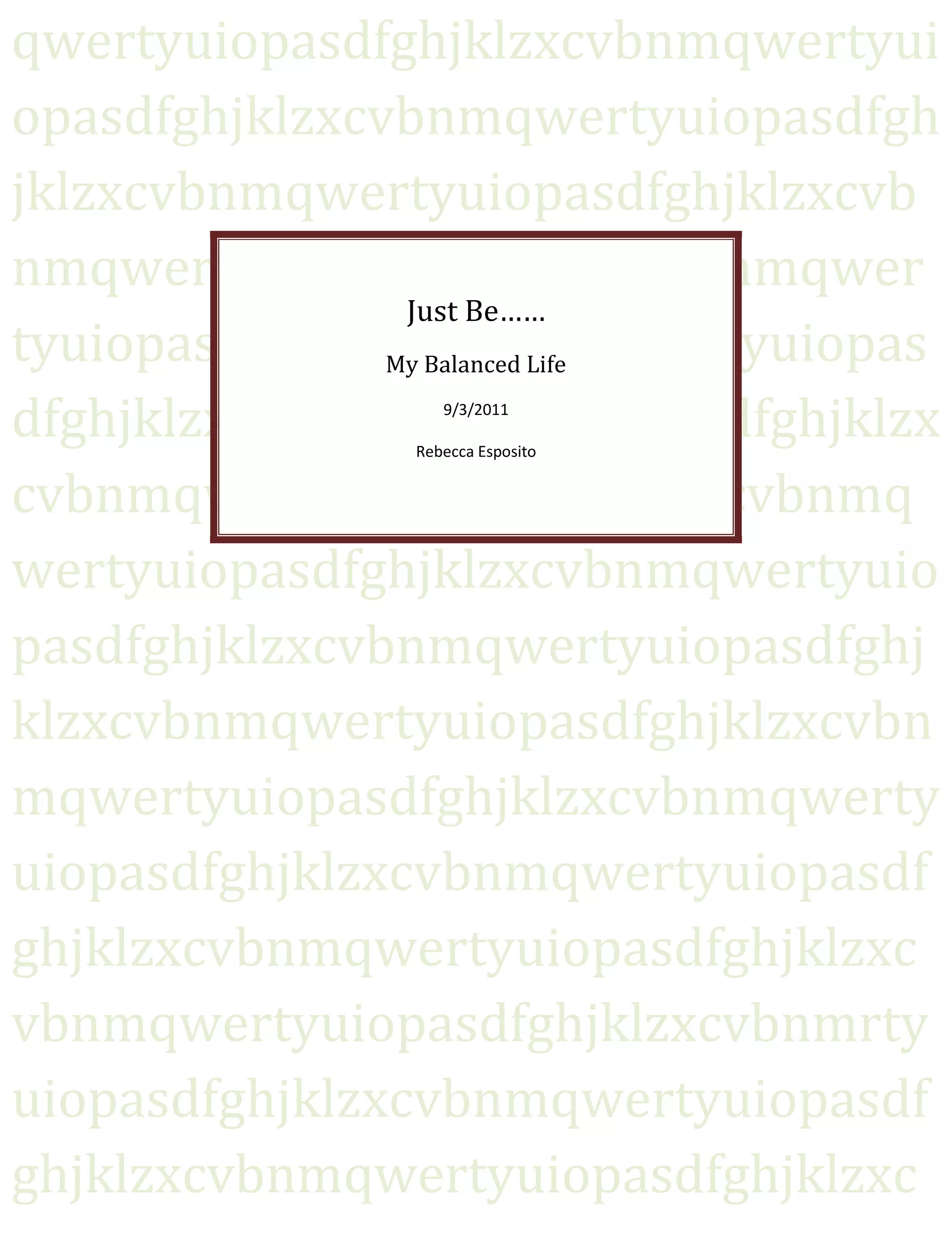 This document discusses developing balance across physical, psychological, and spiritual well-being. The author reflects on their journey to improve each of these aspects in their own life and career in health and wellness. They aim to become a stronger role model by prioritizing physical health through diet changes, exercise like jogging and yoga, and quality time with family. The goal is to rid themselves of stress, grow as a person, and set a good example for clients through continuously working on overall life balance.