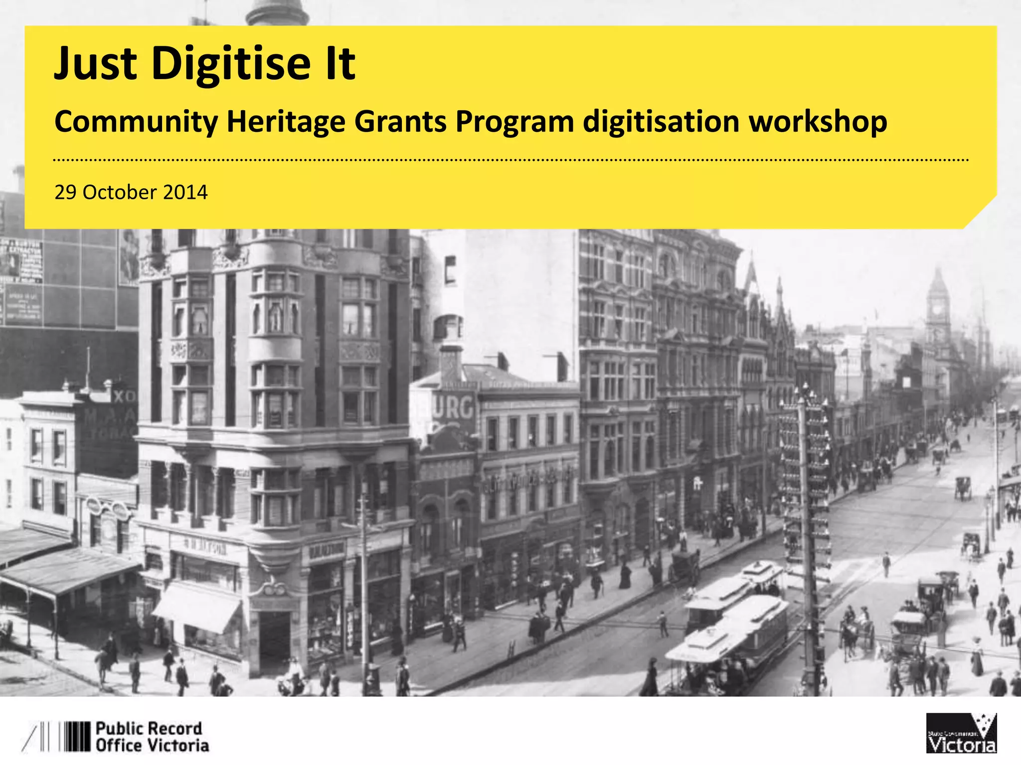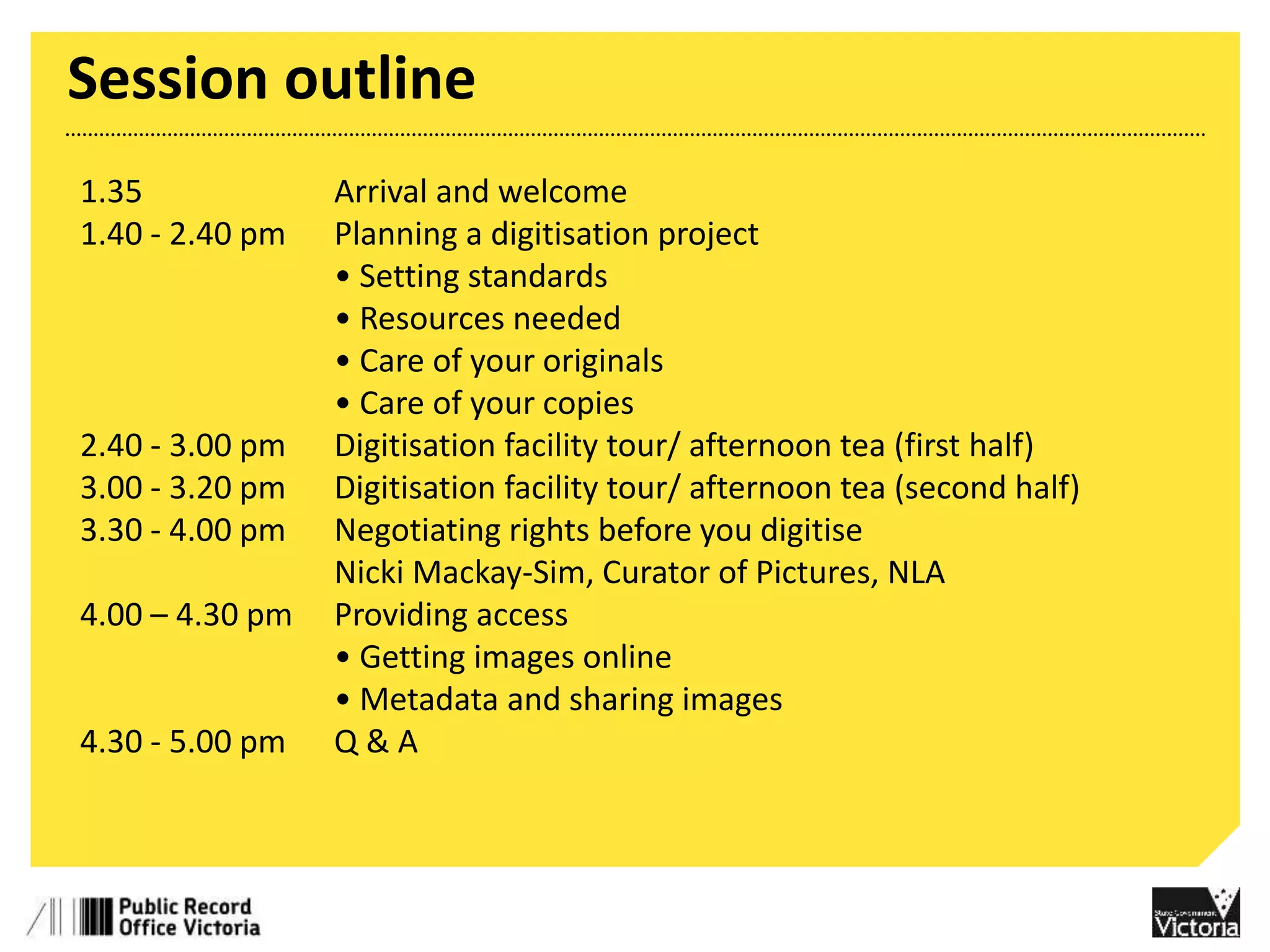 This document outlines the agenda and topics that will be covered in a digitization workshop for community heritage organizations. The session will cover how to plan a digitization project by setting standards, assessing needed resources, and caring for original and digital materials. It will also discuss providing access online, including issues around rights, metadata, and sharing images. Key topics include setting an appropriate level of technical standards based on the project goals and constraints, ensuring backups and long-term preservation of digital files, and creating descriptive metadata to enable discovery and use of digitized collections.