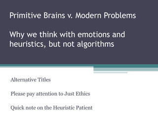 This document provides an overview of a presentation on the new science of morality and how it applies to professional ethics in psychology. It discusses how morality is influenced by emotions and heuristics rather than rational algorithms. It introduces the Ethical Acculturation Model which describes how personal ethics integrate with professional obligations over time. Key concepts covered include moral foundations theory, moral emotions, cognitive biases in decision-making, and applying an ethical framework of autonomy, beneficence, nonmaleficence, fidelity and justice to clinical scenarios. The goal is to help psychologists make ethical decisions by considering both intuitive and deliberative thought processes.