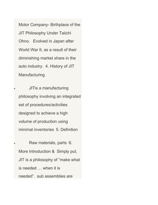 The document provides an overview of just-in-time (JIT) manufacturing. It discusses that JIT is a pull-type system that produces goods and provides services as needed to minimize waste. Key aspects of JIT include minimizing inventory levels, small lot sizes, continuous improvement, quality management, and strong supplier relationships. The goals of JIT are to eliminate waste, disruptions and achieve a balanced, rapid flow of materials through the manufacturing process.