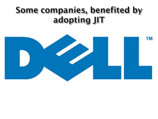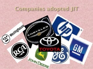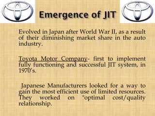 Japanese automakers implemented just-in-time (JIT) manufacturing after WWII to gain more efficient use of limited resources in the face of declining market share. The Toyota Motor Company was the first to fully implement a successful JIT system in the 1970s. JIT aims to produce only what is needed when it is needed and keeps stock levels minimal by having components arrive just before assembly in a close supplier relationship, reducing costs from excess inventory.