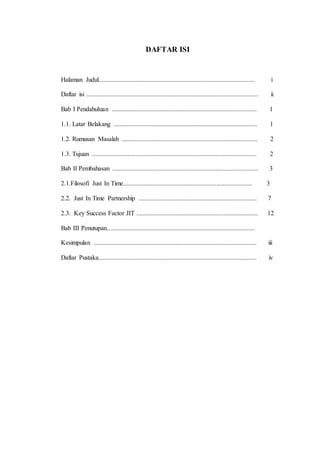 Dokumen ini membahas konsep dan filosofi Just In Time (JIT) dalam manajemen operasi, yang menekankan produksi berdasarkan permintaan untuk mengurangi pemborosan dan meningkatkan efisiensi. JIT bertujuan meningkatkan produktivitas dan kualitas dengan menghilangkan biaya persediaan yang tidak perlu, serta memperkuat kemitraan dengan pemasok. Selain itu, dokumen juga mengidentifikasi faktor kunci keberhasilan JIT, termasuk keterlibatan pemasok dan manajemen persediaan yang efektif.