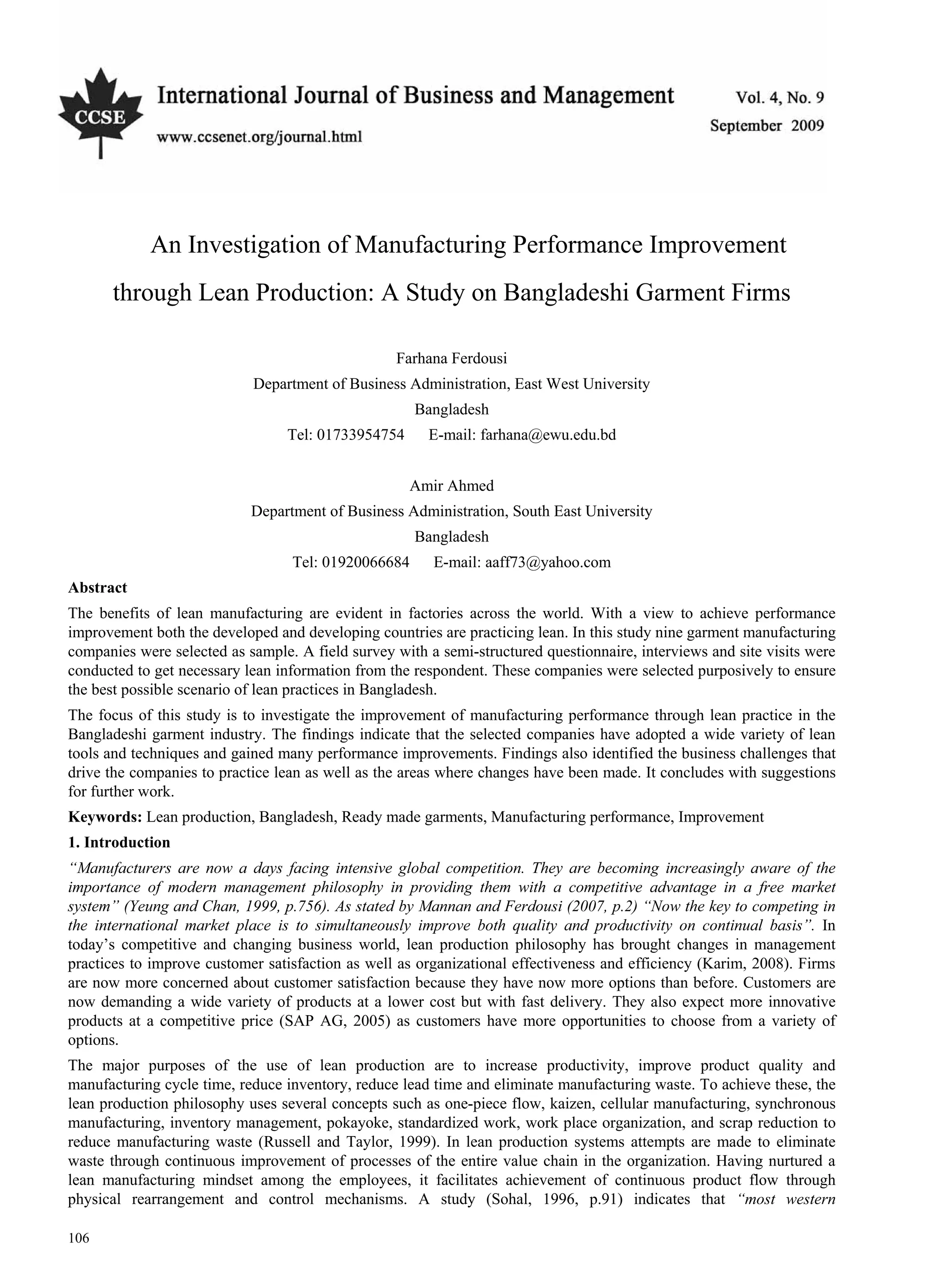 This document summarizes a study on lean manufacturing practices in the Bangladeshi garment industry. Nine garment companies were surveyed about their lean implementation and the effects. The main findings were: