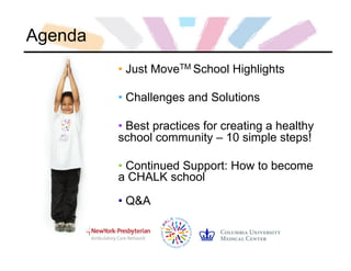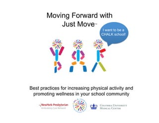 The document provides best practices for schools to implement the Just Move physical activity program and promote overall wellness, including integrating Just Move into classroom and school-wide activities, establishing a wellness council, connecting with community resources, adopting healthy snack policies, applying for grants, and celebrating successes to become a CHALK certified healthy school. It outlines 10 steps schools can take like continuing Just Move in classrooms, hosting events, and inviting workshops to engage students, staff, and families in wellness.