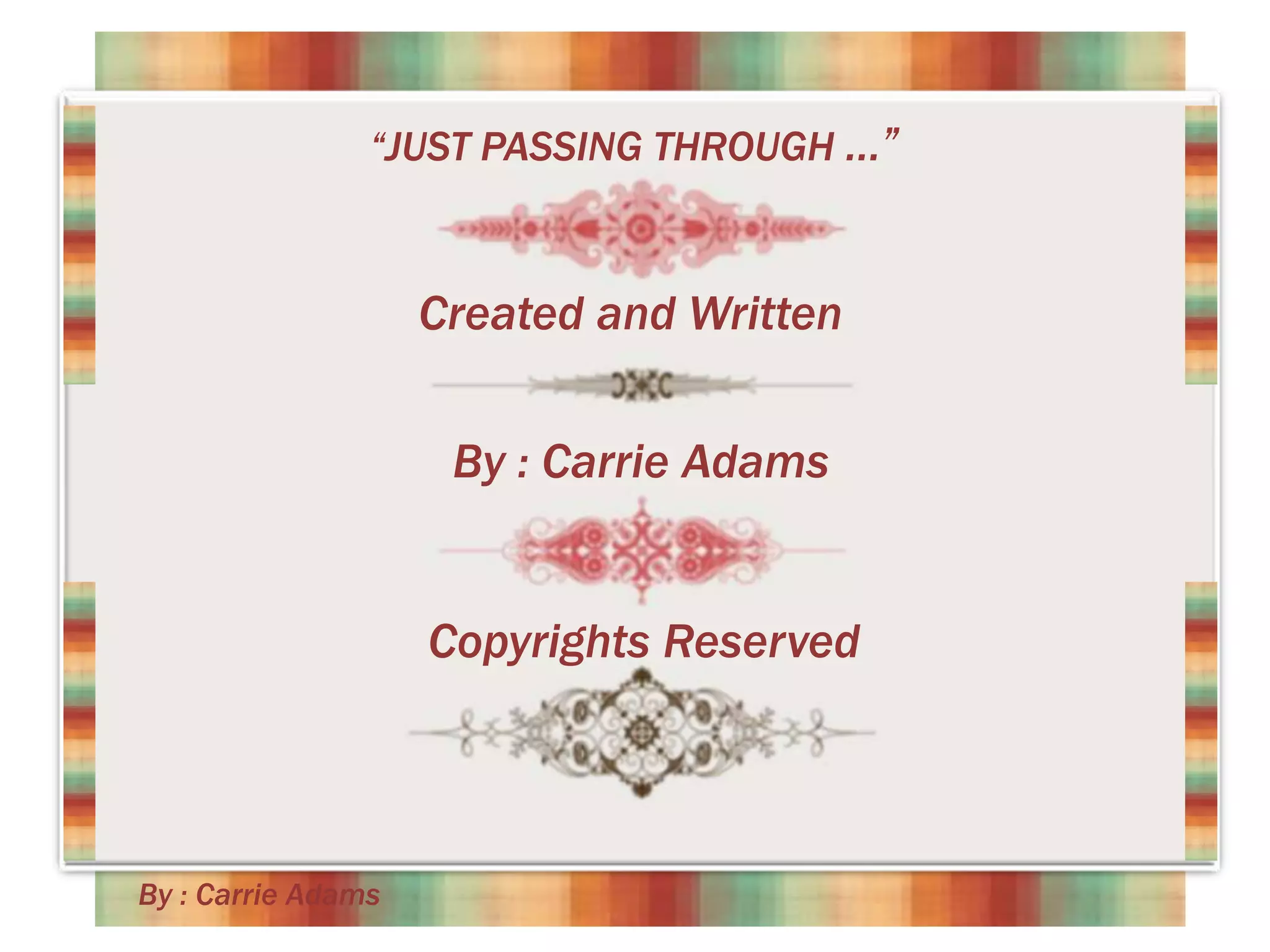 The document is a collection of reflections by Carrie Adams about being terminally ill and separated from her children. She expresses love for Jesus and faith that he will carry her through difficulties. She misses her children greatly and hopes they can understand her illness. Carrie finds strength and comfort in prayer and her relationship with God. She seems at peace with her mortality and ready to pass through this life to her eternal home.