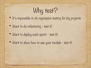The document discusses the importance of testing in large projects for regression, refactoring, and deployment purposes. It outlines various testing tools like Karma, Sinon.js, and Mocha/Chai for unit testing, mocking dependencies, and handling asynchronous behaviors. The document emphasizes the need for testing business logic across models, controllers, and shared functionalities.