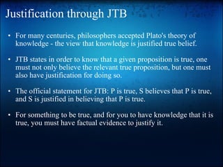 The document discusses justification in knowledge and the justified true belief (JTB) theory of knowledge. It states that to have knowledge, one must not only believe a proposition is true but must also have justification for that belief. It identifies four ways of knowing - language, emotion, reason, and perception - as potential justifications. However, it notes that justification also depends on the reliability of the source and the context, as greater contexts require more robust justification. The document concludes that justification confirms beliefs through ways of knowing but must also consider reliability and context.