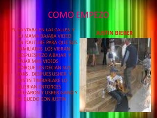 Justin Bieber started his career singing in the streets while his mother uploaded videos of him to YouTube for family to see. As his fan base grew, she uploaded more videos. Usher and Justin Timberlake both wanted to sign Bieber, but Usher won and took Bieber under his wing. Bieber has two siblings - a brother named Jaxon and a sister named Jazmyn. His parents divorced when he was young. His mother is named Pattie Mallette and his father is named Jeremy Bieber. Bieber has since become very famous worldwide and is loved by girls and boys for his amazing singing. He is admired by many girls for his romantic songs.
