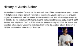 This document provides a biography and discography of Justin Bieber. It summarizes his career from being discovered on YouTube in 2008 at age 12, to releasing his debut album in 2009. It then lists his subsequent albums released between 2010-2015. The document also briefly describes his appearance, popular songs, and the type of music and fans he attracts. It concludes with discussing the song "Sorry" and providing lyrics.