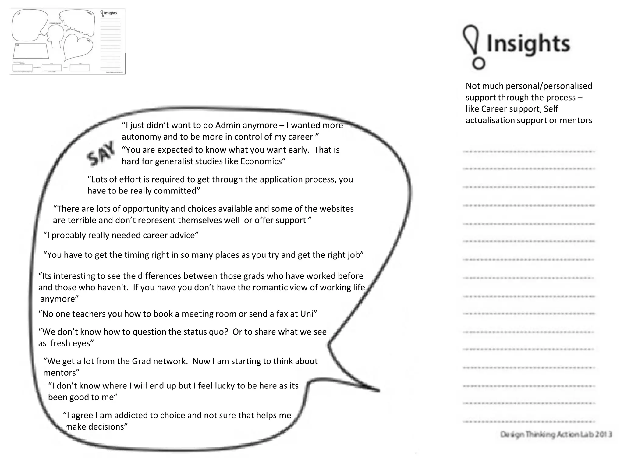 The document discusses the experiences and perspectives of graduates. It notes that graduates come from different backgrounds and may have different expectations, but there is little personalized support throughout the application and placement process. It also notes that the process is very competitive yet employers depend on graduates to support each other. Prototypes were created for ideas to better support graduates in exploring their interests and strengths, including a quote book and a longitudinal app or website. Testing provided feedback on how to improve the prototypes and potential challenges with making disruptive ideas a reality.