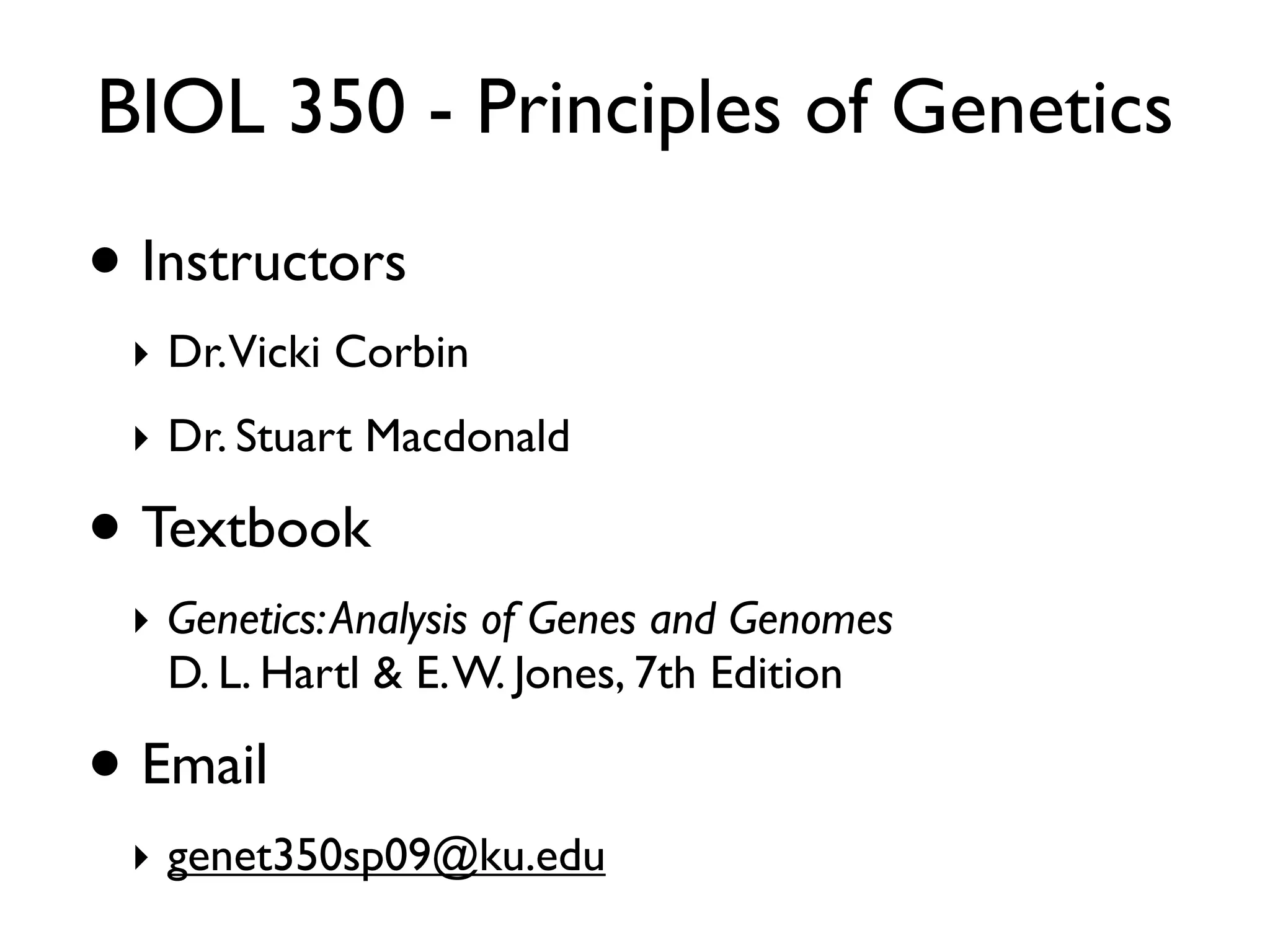 This document provides an overview of the BIOL 350 - Principles of Genetics course including instructors, textbook, email, and chapter topics. The chapter topics cover the basics of genetics including genes, genomes, DNA structure and function, DNA replication, transcription, translation, gene mutations, and how traits are influenced by multiple genes and the environment. The document uses examples like Griffith's experiments, the structure of DNA, DNA replication, phenylketonuria, and coat color in cats to illustrate key genetic concepts.