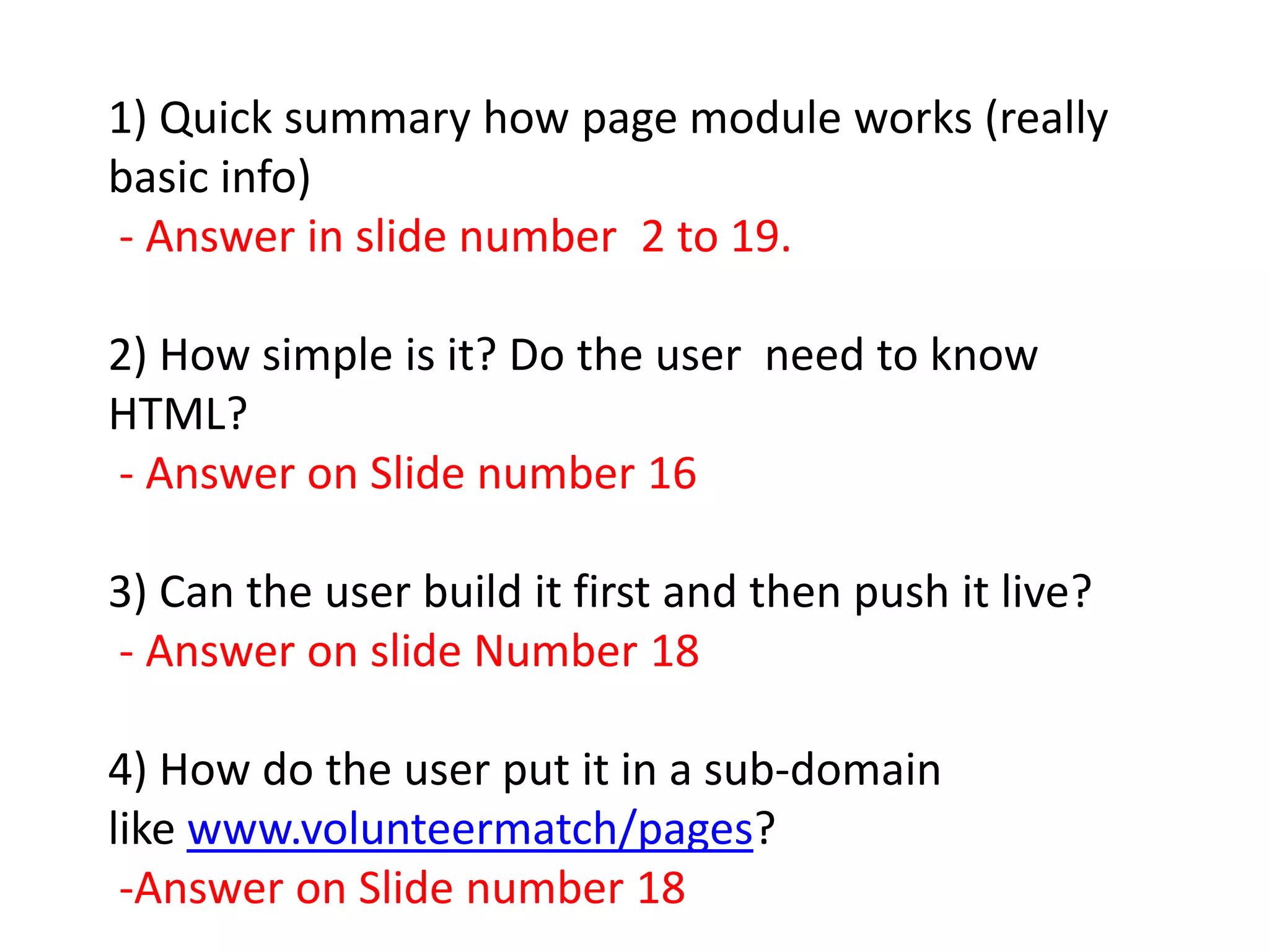 1) The page module allows users to build and publish pages without needing HTML knowledge by dragging and dropping content blocks.