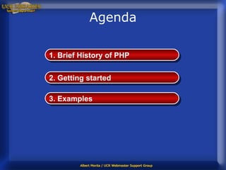 The document provides an introduction and overview of PHP including a brief history, getting started instructions, examples of using PHP for templates and page counters, and additional resources. It discusses how PHP was created in 1994 and evolved through versions 2-5, how to embed PHP code in HTML pages using tags, demonstrates conditional statements and includes, and provides a step-by-step example of implementing a simple page counter using PHP.