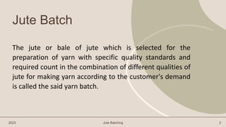 This presentation discusses the process of jute batching. Jute batching involves selecting a combination of different qualities of jute fibers to make yarn according to customer demand. The objectives of batching are to make the fibers flexible and remove hardness. Factors like cost, quality, and availability are considered for batch selection. Different compositions are used for different types of yarns, mixing hard and soft jute fibers. Emulsions are applied to make the fibers flexible for spinning. The emulsion must have appropriate properties and not harm machines or fibers.