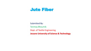 Jute is a natural fiber known as the "Golden Fiber" that comes from the stem of the jute plant. It is the second most produced textile fiber in the world after cotton. Bangladesh is the largest cultivator and producer of raw jute. Jute requires a warm, humid climate and is harvested between 120-150 days after planting. It is composed mainly of cellulose and lignin. Jute is used to make sacks, packaging cloth, carpets, and mixed with wool for clothing due to its strength and low cost. While jute processing can cause pollution, the fiber is biodegradable and adds nutrients to soil. Its global harvest and sale amounts to over 3 million tons annually worth