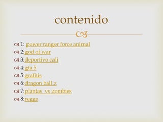 The document lists the contact information for Juan David Sierra Gaviria and his professor John Alexander Caraballo Acosta, along with their respective blogs. It then lists 8 topics: power ranger force animal, god of war, deportivo cali, gta 5, grafitis, dragon ball z, plantas vs zombies, and regge. Each topic is marked with its own header.