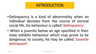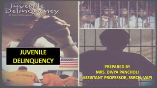 This document discusses juvenile delinquency and was prepared by Mrs. Divya Pancholi. It defines juvenile delinquency as illegal behavior by a minor that would be considered criminal. It describes characteristics of juvenile delinquents such as being defiant, resentful, and impulsive. The document outlines preventive and rehabilitative measures that can be taken to address juvenile delinquency, including improving family life, schooling, counseling, and legislative actions like probation or secured juvenile facilities.