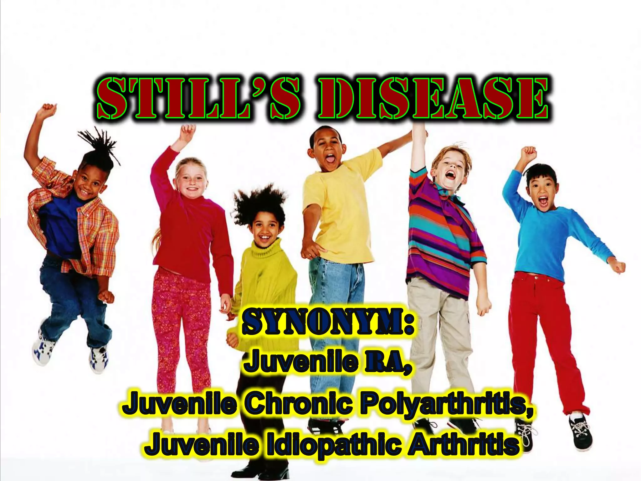 Juvenile rheumatoid arthritis (JRA) is a term used to describe arthritis in children under 16 years old that lasts at least 6 weeks. It can be classified into oligoarticular JRA which affects 4 or fewer joints, polyarticular JRA which affects 5 or more joints, and systemic JRA which is characterized by arthritis, fever, and rash. Left untreated, JRA can lead to joint damage, deformities, limited movement, and growth issues.