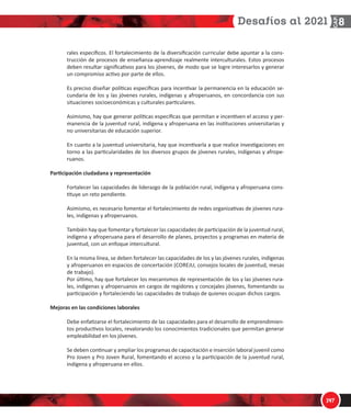 ĨŽƌƚĂůĞĐŝŵŝĞŶƚŽ ĚĞ ůĂ ĚŝǀĞƌƐŝĮĐĂĐŝſŶ ĐƵƌƌŝĐƵůĂƌ ĚĞďĞ ĂƉƵŶƚĂƌ Ă ůĂ ĐŽŶƐͲ ƚƌƵĐĐŝſŶ ĚĞ ƉƌŽĐĞƐŽƐ ĚĞ ĞŶƐĞŹĂŶnjĂͲĂƉƌĞŶĚŝnjĂũĞ ƌĞĂůŵĞŶƚĞ ŝŶƚĞƌĐƵůƚƵƌĂůĞƐ͘ ƐƚŽƐ ƉƌŽĐĞƐŽƐ ĚĞďĞŶ ƌĞƐƵůƚĂƌ ƐŝŐŶŝĮĐĂƟǀŽƐ ƉĂƌĂ ůŽƐ ũſǀĞŶĞƐ͕ ĚĞ ŵŽĚŽ ƋƵĞ ƐĞ ůŽŐƌĞ ŝŶƚĞƌĞƐĂƌůŽƐ LJ ŐĞŶĞƌĂƌ ƵŶ ĐŽŵƉƌŽŵŝƐŽ ĂĐƟǀŽ ƉŽƌ ƉĂƌƚĞ ĚĞ ĞůůŽƐ͘ Ɛ ƉƌĞĐŝƐŽ ĚŝƐĞŹĂƌ ƉŽůşƟĐĂƐ ĞƐƉĞĐşĮĐĂƐ ƉĂƌĂ ŝŶĐĞŶƟǀĂƌ ůĂ ƉĞƌŵĂŶĞŶĐŝĂ ĞŶ ůĂ ĞĚƵĐĂĐŝſŶ ƐĞͲ ĐƵŶĚĂƌŝĂ ĚĞ ůŽƐ LJ ůĂƐ ũſǀĞŶĞƐ ƌƵƌĂůĞƐ͕ ŝŶĚşŐĞŶĂƐ LJ ĂĨƌŽƉĞƌƵĂŶŽƐ͕ ĞŶ ĐŽŶĐŽƌĚĂŶĐŝĂ ĐŽŶ ƐƵƐ ƐŝƚƵĂĐŝŽŶĞƐ ƐŽĐŝŽĞĐŽŶſŵŝĐĂƐ LJ ĐƵůƚƵƌĂůĞƐ ƉĂƌƟĐƵůĂƌĞƐ͘ ƐŝŵŝƐŵŽ͕ ŚĂLJ ƋƵĞ ŐĞŶĞƌĂƌ ƉŽůşƟĐĂƐ ĞƐƉĞĐşĮĐĂƐ ƋƵĞ ƉĞƌŵŝƚĂŶ Ğ ŝŶĐĞŶƟǀĞŶ Ğů ĂĐĐĞƐŽ LJ ƉĞƌͲ ŵĂŶĞŶĐŝĂ ĚĞ ůĂ ũƵǀĞŶƚƵĚ ƌƵƌĂů͕ ŝŶĚşŐĞŶĂ LJ ĂĨƌŽƉĞƌƵĂŶĂ ĞŶ ůĂƐ ŝŶƐƟƚƵĐŝŽŶĞƐ ƵŶŝǀĞƌƐŝƚĂƌŝĂƐ LJ ŶŽ ƵŶŝǀĞƌƐŝƚĂƌŝĂƐ ĚĞ ĞĚƵĐĂĐŝſŶ ƐƵƉĞƌŝŽƌ͘ Ŷ ĐƵĂŶƚŽ Ă ůĂ ũƵǀĞŶƚƵĚ ƵŶŝǀĞƌƐŝƚĂƌŝĂ͕ ŚĂLJ ƋƵĞ ŝŶĐĞŶƟǀĂƌůĂ Ă ƋƵĞ ƌĞĂůŝĐĞ ŝŶǀĞƐƟŐĂĐŝŽŶĞƐ ĞŶ ƚŽƌŶŽ Ă ůĂƐ ƉĂƌƟĐƵůĂƌŝĚĂĚĞƐ ĚĞ ůŽƐ ĚŝǀĞƌƐŽƐ ŐƌƵƉŽƐ ĚĞ ũſǀĞŶĞƐ ƌƵƌĂůĞƐ͕ ŝŶĚşŐĞŶĂƐ LJ ĂĨƌŽƉĞͲ ƌƵĂŶŽƐ͘ WĂƌƟĐŝƉĂĐŝſŶ ĐŝƵĚĂĚĂŶĂ LJ ƌĞƉƌĞƐĞŶƚĂĐŝſŶ ŽƌƚĂůĞĐĞƌ ůĂƐ ĐĂƉĂĐŝĚĂĚĞƐ ĚĞ ůŝĚĞƌĂnjŐŽ ĚĞ ůĂ ƉŽďůĂĐŝſŶ ƌƵƌĂů͕ ŝŶĚşŐĞŶĂ LJ ĂĨƌŽƉĞƌƵĂŶĂ ĐŽŶƐͲ ƟƚƵLJĞ ƵŶ ƌĞƚŽ ƉĞŶĚŝĞŶƚĞ͘ ƐŝŵŝƐŵŽ͕ ĞƐ ŶĞĐĞƐĂƌŝŽ ĨŽŵĞŶƚĂƌ Ğů ĨŽƌƚĂůĞĐŝŵŝĞŶƚŽ ĚĞ ƌĞĚĞƐ ŽƌŐĂŶŝnjĂƟǀĂƐ ĚĞ ũſǀĞŶĞƐ ƌƵƌĂͲ ůĞƐ͕ ŝŶĚşŐĞŶĂƐ LJ ĂĨƌŽƉĞƌƵĂŶŽƐ͘ dĂŵďŝĠŶ ŚĂLJ ƋƵĞ ĨŽŵĞŶƚĂƌ LJ ĨŽƌƚĂůĞĐĞƌ ůĂƐ ĐĂƉĂĐŝĚĂĚĞƐ ĚĞ ƉĂƌƟĐŝƉĂĐŝſŶ ĚĞ ůĂ ũƵǀĞŶƚƵĚ ƌƵƌĂů͕ ŝŶĚşŐĞŶĂ LJ ĂĨƌŽƉĞƌƵĂŶĂ ƉĂƌĂ Ğů ĚĞƐĂƌƌŽůůŽ ĚĞ ƉůĂŶĞƐ͕ ƉƌŽLJĞĐƚŽƐ LJ ƉƌŽŐƌĂŵĂƐ ĞŶ ŵĂƚĞƌŝĂ ĚĞ ũƵǀĞŶƚƵĚ͕ ĐŽŶ ƵŶ ĞŶĨŽƋƵĞ ŝŶƚĞƌĐƵůƚƵƌĂů͘ Ŷ ůĂ ŵŝƐŵĂ ůşŶĞĂ͕ ƐĞ ĚĞďĞŶ ĨŽƌƚĂůĞĐĞƌ ůĂƐ ĐĂƉĂĐŝĚĂĚĞƐ ĚĞ ůŽƐ LJ ůĂƐ ũſǀĞŶĞƐ ƌƵƌĂůĞƐ͕ ŝŶĚşŐĞŶĂƐ LJ ĂĨƌŽƉĞƌƵĂŶŽƐ ĞŶ ĞƐƉĂĐŝŽƐ ĚĞ ĐŽŶĐĞƌƚĂĐŝſŶ ;KZ:h͕ ĐŽŶƐĞũŽƐ ůŽĐĂůĞƐ ĚĞ ũƵǀĞŶƚƵĚ͕ ŵĞƐĂƐ ĚĞ ƚƌĂďĂũŽͿ͘ WŽƌ ƷůƟŵŽ͕ ŚĂLJ ƋƵĞ ĨŽƌƚĂůĞĐĞƌ ůŽƐ ŵĞĐĂŶŝƐŵŽƐ ĚĞ ƌĞƉƌĞƐĞŶƚĂĐŝſŶ ĚĞ ůŽƐ LJ ůĂƐ ũſǀĞŶĞƐ ƌƵƌĂͲ ůĞƐ͕ ŝŶĚşŐĞŶĂƐ LJ ĂĨƌŽƉĞƌƵĂŶŽƐ ĞŶ ĐĂƌŐŽƐ ĚĞ ƌĞŐŝĚŽƌĞƐ LJ ĐŽŶĐĞũĂůĞƐ ũſǀĞŶĞƐ͕ ĨŽŵĞŶƚĂŶĚŽ ƐƵ ƉĂƌƟĐŝƉĂĐŝſŶ LJ ĨŽƌƚĂůĞĐŝĞŶĚŽ ůĂƐ ĐĂƉĂĐŝĚĂĚĞƐ ĚĞ ƚƌĂďĂũŽ ĚĞ ƋƵŝĞŶĞƐ ŽĐƵƉĂŶ ĚŝĐŚŽƐ ĐĂƌŐŽƐ͘ DĞũŽƌĂƐ ĞŶ ůĂƐ ĐŽŶĚŝĐŝŽŶĞƐ ůĂďŽƌĂůĞƐ ĞďĞ ĞŶĨĂƟnjĂƌƐĞ Ğů ĨŽƌƚĂůĞĐŝŵŝĞŶƚŽ ĚĞ ůĂƐ ĐĂƉĂĐŝĚĂĚĞƐ ƉĂƌĂ Ğů ĚĞƐĂƌƌŽůůŽ ĚĞ ĞŵƉƌĞŶĚŝŵŝĞŶͲ ƚŽƐ ƉƌŽĚƵĐƟǀŽƐ ůŽĐĂůĞƐ͕ ƌĞǀĂůŽƌĂŶĚŽ ůŽƐ ĐŽŶŽĐŝŵŝĞŶƚŽƐ ƚƌĂĚŝĐŝŽŶĂůĞƐ ƋƵĞ ƉĞƌŵŝƚĂŶ ŐĞŶĞƌĂƌ ĞŵƉůĞĂďŝůŝĚĂĚ ĞŶ ůŽƐ ũſǀĞŶĞƐ͘ ^Ğ ĚĞďĞŶ ĐŽŶƟŶƵĂƌ LJ ĂŵƉůŝĂƌ ůŽƐ ƉƌŽŐƌĂŵĂƐ ĚĞ ĐĂƉĂĐŝƚĂĐŝſŶ Ğ ŝŶƐĞƌĐŝſŶ ůĂďŽƌĂů ũƵǀĞŶŝů ĐŽŵŽ WƌŽ :ŽǀĞŶ LJ WƌŽ :ŽǀĞŶ ZƵƌĂů͕ ĨŽŵĞŶƚĂŶĚŽ Ğů ĂĐĐĞƐŽ LJ ůĂ ƉĂƌƟĐŝƉĂĐŝſŶ ĚĞ ůĂ ũƵǀĞŶƚƵĚ ƌƵƌĂů͕ ŝŶĚşŐĞŶĂ LJ ĂĨƌŽƉĞƌƵĂŶĂ ĞŶ ĞůůŽƐ͘