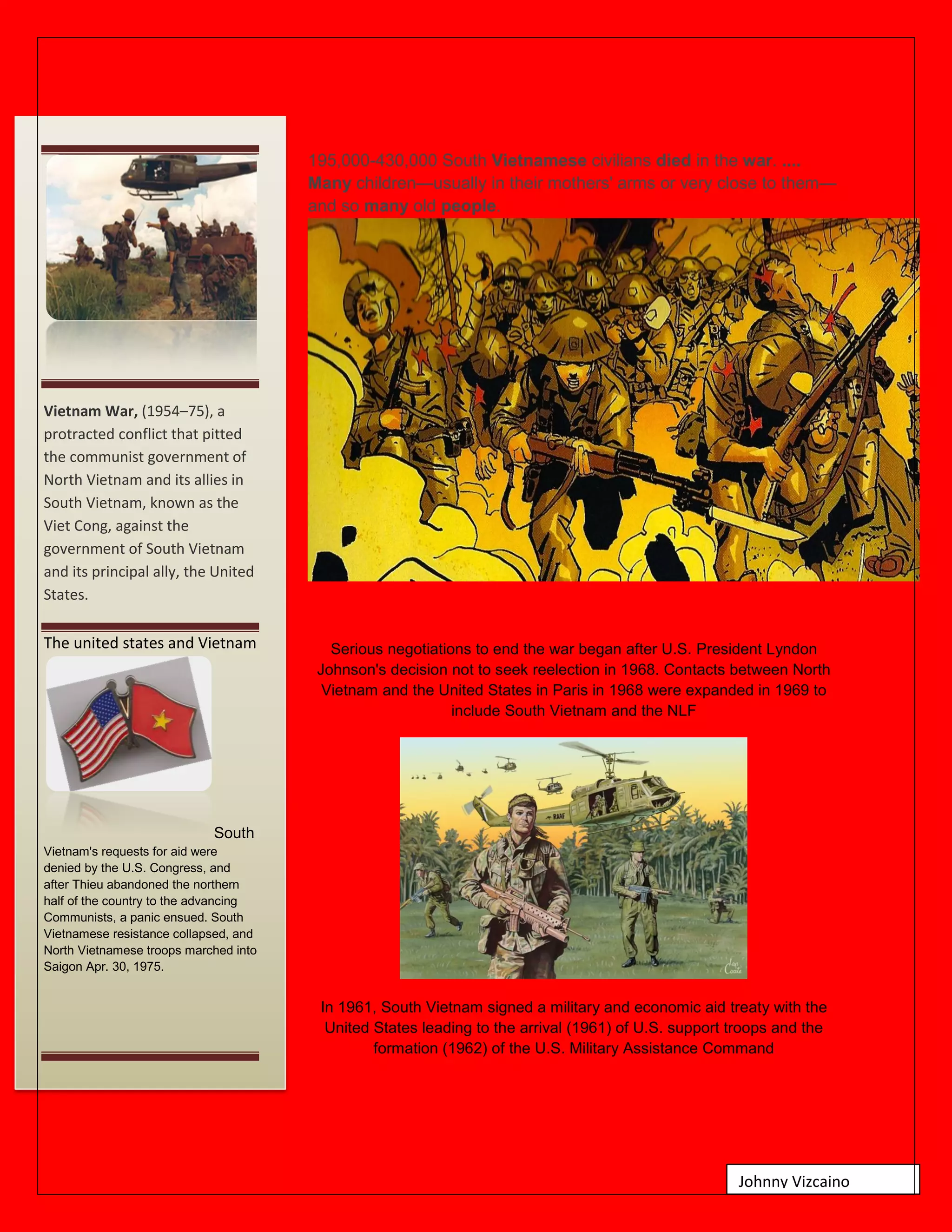 The document summarizes key events in the Vietnam War between 1954-1975. It describes how the war pitted North Vietnam and communist allies against South Vietnam and its ally the United States. Serious peace negotiations began in 1968 under President Johnson and expanded in 1969 to include all parties. However, by 1975 South Vietnam's requests for aid were denied by Congress and its forces collapsed as North Vietnamese troops advanced and took Saigon. The United States had begun supporting South Vietnam militarily in 1961.