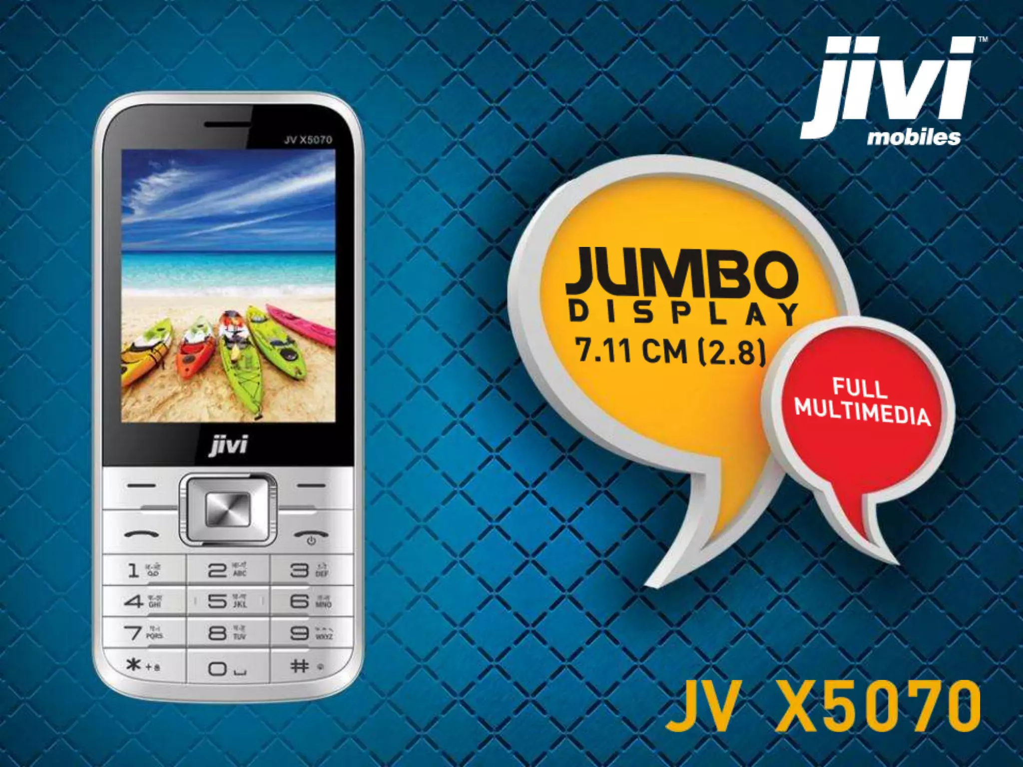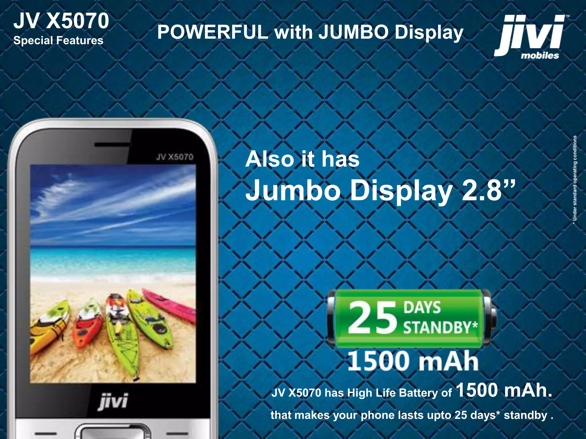 The JV X5070 smartphone has a 2.8 inch Jumbo Display, 1500 mAh battery that provides up to 25 days standby time, and features like a camera, 3.5 mm audio jack, MP3/MP4 player, FM radio, Bluetooth, and call recording. It also has multimedia playback capabilities, a micro USB charger, and supports up to 8GB of external storage.