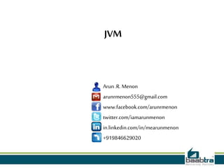 This document provides information about the Java Virtual Machine (JVM). It defines the JVM as a software layer that allows Java bytecode to run on different platforms. It explains that the JVM converts Java bytecode into machine language that can be executed by the hardware. It also discusses the Java Runtime Environment (JRE) which provides an implementation of the JVM to run Java programs, and the Java Development Kit (JDK) which includes the JRE plus development tools. Just-in-time (JIT) compilation is also summarized as improving Java program performance by compiling bytecode sections with similar functionality together.
