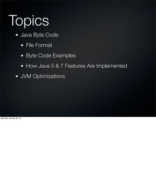 The document discusses the internals of the Java Virtual Machine (JVM) including the class file format, byte code, and optimizations performed by the JVM. It notes that the class file format begins with the magic value CAFEBABE followed by version information and a constant pool. It then describes the layout of fields, methods, and other internal structures including flags, names, descriptors, and attributes. Understanding the JVM internals can help with debugging and performance.