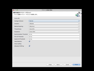 Oracle JDK7u40以降 標準でついてくる • FlightRecorderとの連携が強力 • トリガー機能 • CPU使用率が閾値を超えたらメールす るなど