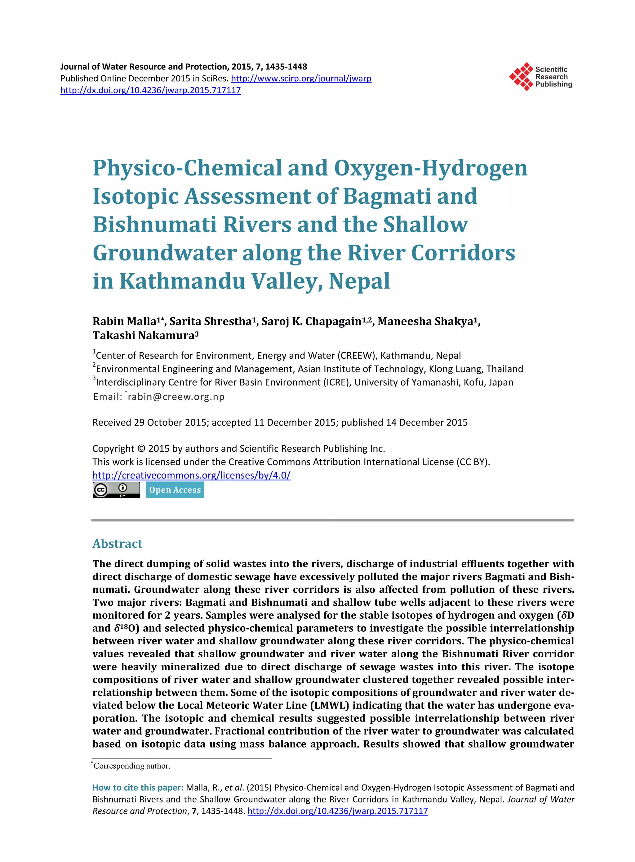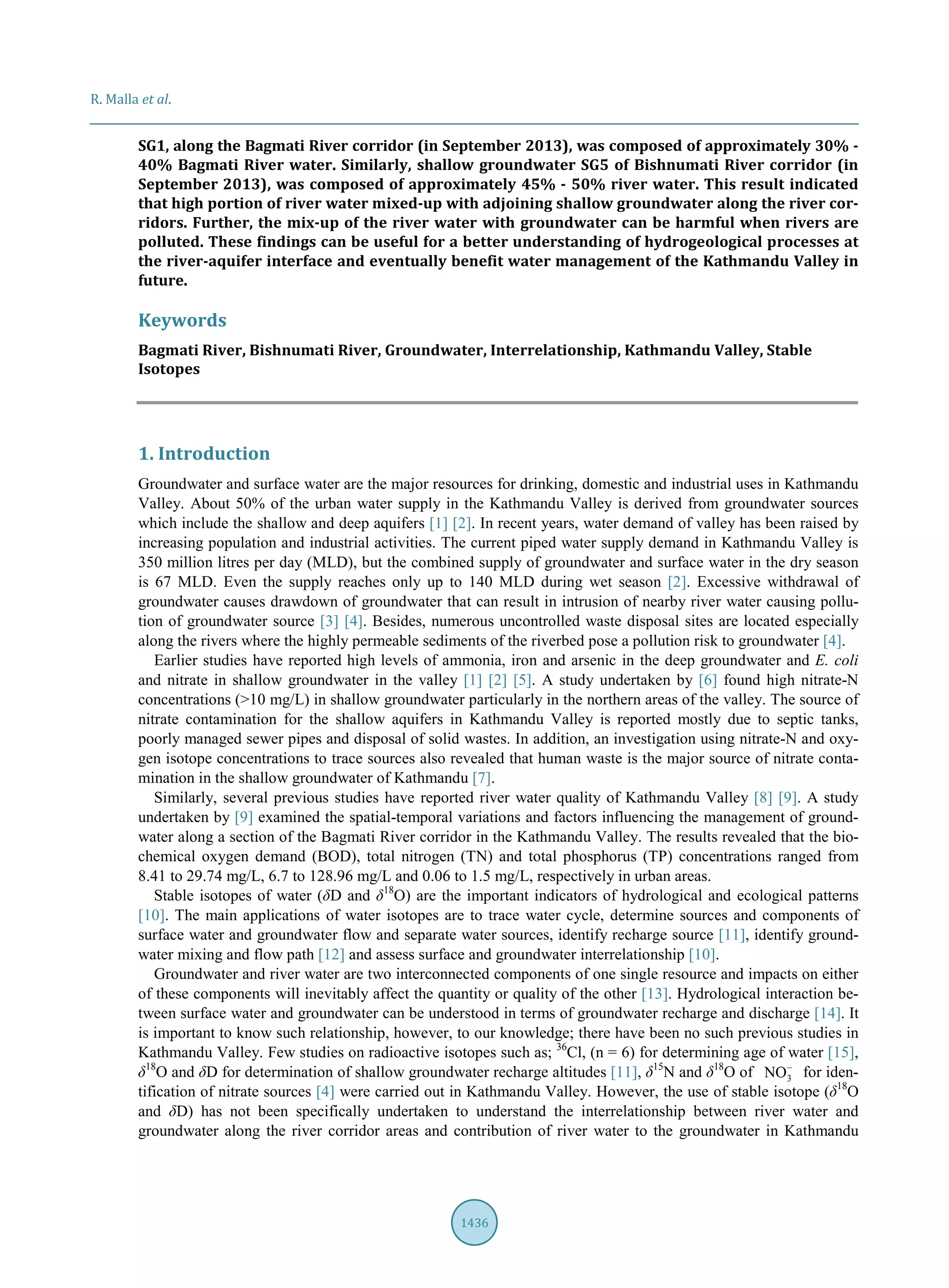 This document summarizes a study that assessed the physico-chemical and isotopic characteristics of the Bagmati and Bishnumati Rivers and shallow groundwater along their corridors in Kathmandu Valley, Nepal over a two-year period. Samples were analyzed for stable isotopes of hydrogen and oxygen (δD and δ18O) and selected physico-chemical parameters to investigate the potential interrelationship between river water and shallow groundwater. Isotopic and chemical results suggested shallow groundwater and river water are interconnected, with river water composing 30%-50% of some shallow groundwater samples based on isotopic mixing calculations. The study provides useful insights into hydrogeological processes at the river-aquifer interface that