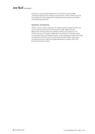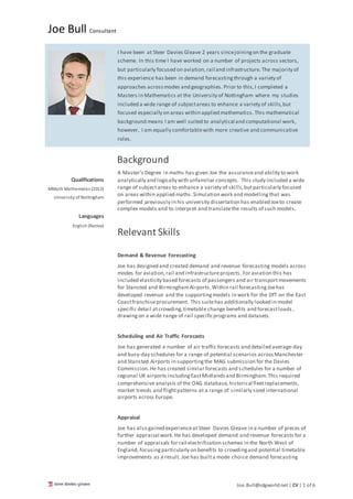 Joe Bull has 2 years of experience at Steer Davies Gleave focused on demand forecasting across various transportation sectors such as aviation, rail, and infrastructure. He has a Master's Degree in Mathematics from the University of Nottingham which provided strong analytical and modeling skills. Some of his recent projects include developing demand and revenue forecasts for rail electrification schemes in Northwest England, constructing mode choice models for high speed rail projects, and providing air traffic forecasts for various airports.