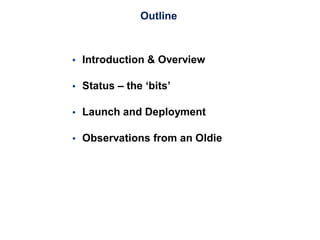 The document provides a status update on the James Webb Space Telescope (JWST) project. It discusses that the launch readiness date is October 31, 2018 and the telescope is optimized for infrared observations between 0.6-28 microns. It summarizes that the key science goals are to study the origin and evolution of galaxies, stars, and planetary systems by looking far back in time and space.