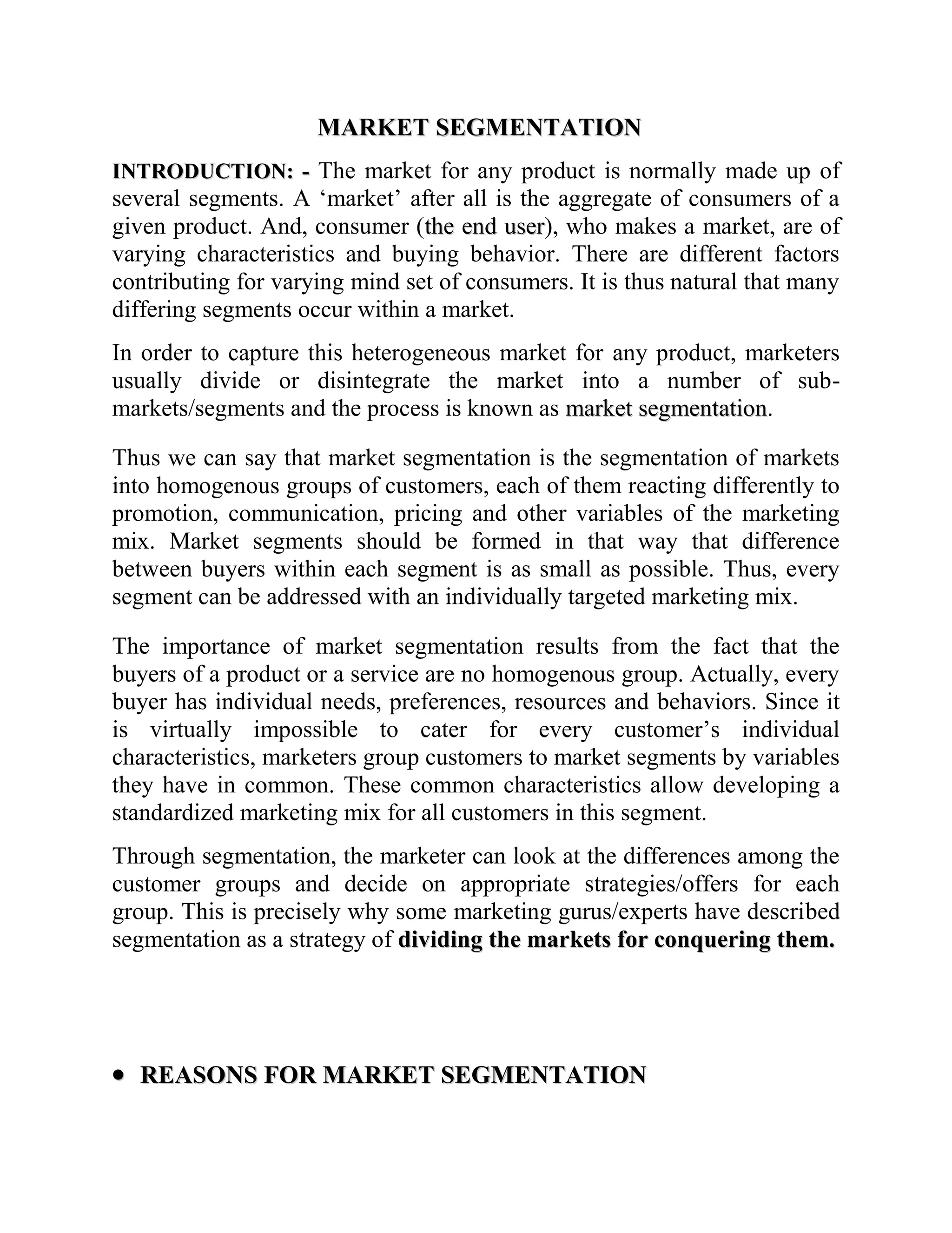 Market segmentation involves dividing a market into subgroups of customers with distinct needs, characteristics, or behaviors in order to develop targeted marketing strategies. The key benefits of market segmentation include allowing companies to focus their marketing efforts on specific customer segments, develop products that better meet the needs of segments, and set prices appropriate for each segment's willingness to pay. Common bases used to segment consumer markets include geographic, demographic, psychographic, and behavioral factors.