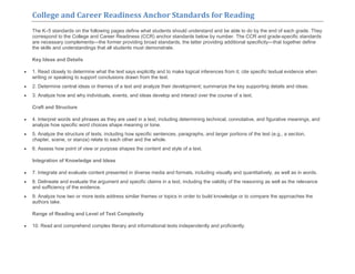The document provides a correlation between the 2010 Common Core State Standards and the Kansas Curricular Standards for Reading and Writing for grades K-1. It lists the Common Core standards, followed by any major differences from the Kansas standards. For 1st grade literature, major differences include identifying words/phrases that suggest feelings, explaining differences between story and information books, and identifying the storyteller. For informational text, differences are using text features to locate information and identifying an author's reasons to support points. Foundational skills differences include knowing long/short vowel conventions and decoding multisyllabic words.