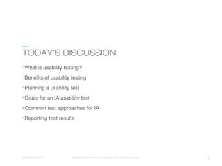 The document discusses usability testing for information architecture (IA). It defines usability testing as observing users performing tasks to evaluate a design against success criteria. Conducting usability tests throughout development can provide important insights. For IA testing, common goals are verifying terminology, groupings, navigation flows, and user satisfaction with the foundational structure. Example methods covered are card sorting, tree testing, and prototype navigation testing. The document stresses the importance of focusing test reports on significant findings and actionable recommendations while acknowledging constraints.