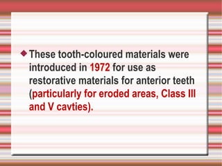 Glass ionomer cements were introduced in 1972 as tooth-colored restorative materials that bond chemically to dental tissues and release fluoride over time. They are classified into conventional, resin-modified, and metal-reinforced types. Glass ionomer cements set via an acid-base reaction between a fluoroaluminosilicate glass powder and an aqueous polyalkenoic acid liquid. They offer advantages like adhesion, fluoride release, and marginal sealing but are also brittle and soluble. Glass ionomer cements are used for luting, restorations, liners, fissure sealants, orthodontic applications, and core buildups.