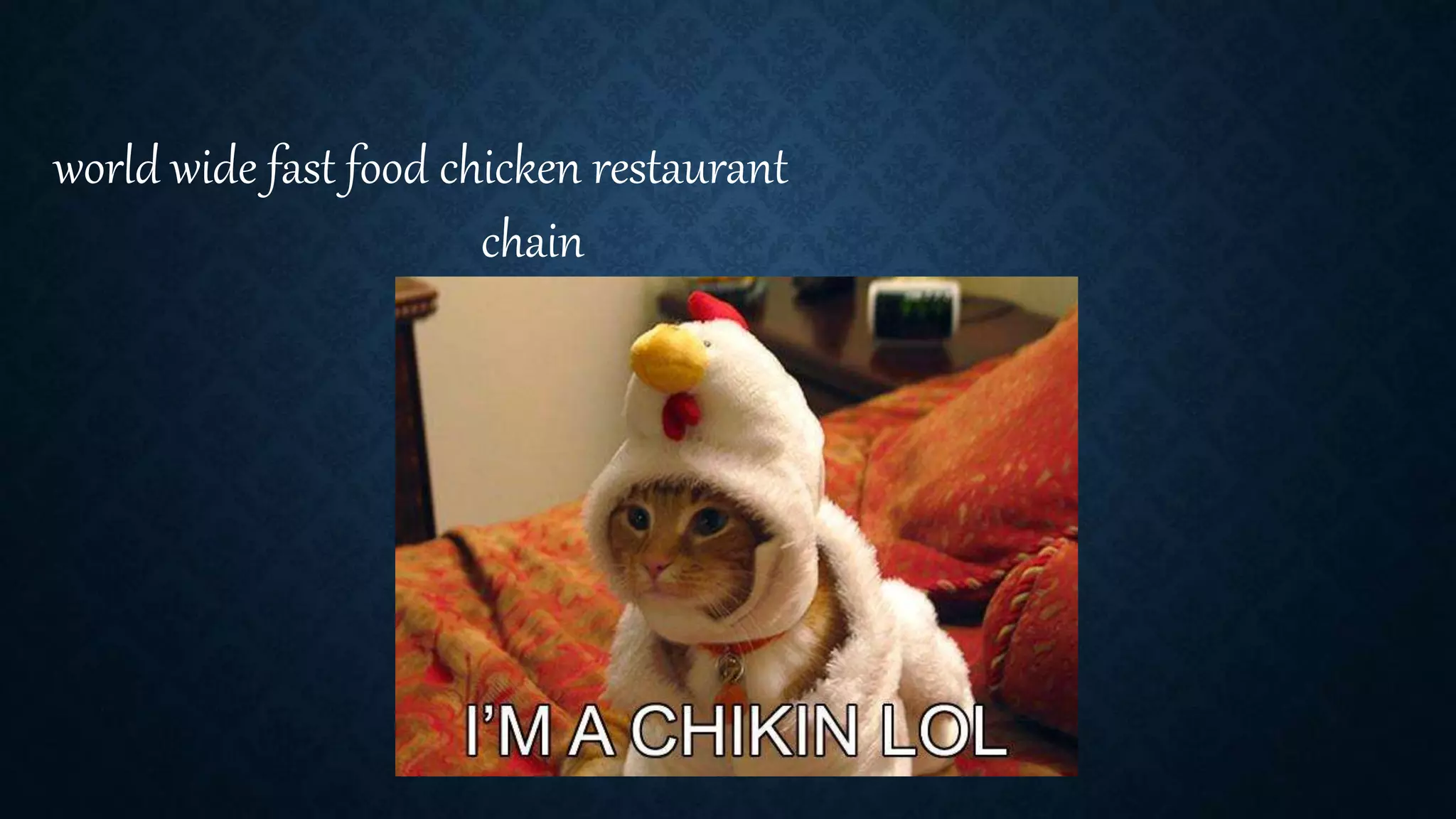 The presentation discusses the history of KFC, founded by Colonel Harland Sanders in 1930, originally known as 'Sanders Court & Cafe.' It became a subsidiary of Yum Brands in 2002 and currently operates over 13,000 restaurants worldwide. KFC's focus on quality assurance is encapsulated in its 'CHAMPS' standards, emphasizing cleanliness, hospitality, accuracy, maintenance, product quality, and speed of service.