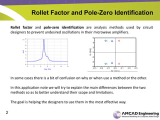 This document compares Rollet factor analysis and pole-zero identification for assessing stability in microwave amplifiers. Rollet factor analysis determines if a circuit could exhibit negative resistance for any passive source/load impedances, but does not guarantee oscillation. Pole-zero identification directly tests stability by identifying unstable poles. It can predict stability over a range of fixed impedances or for large signal regimes, and can verify the Rollet proviso by identifying internal instabilities. The document provides examples of incorrect Rollet factor use and emphasizes always verifying the Rollet proviso, especially for multistage amplifiers, using pole-zero identification.