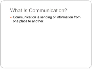 Communication is the sending of information from one person to another and includes both verbal and nonverbal components. Effective communication in a medical office requires listening skills, speaking clearly, maintaining appropriate eye contact and body language, and considering factors such as cultural differences, medical terminology, and privacy. Proper telephone etiquette, business writing, and mail processing are also important for clear transmission of information within and outside the medical practice.