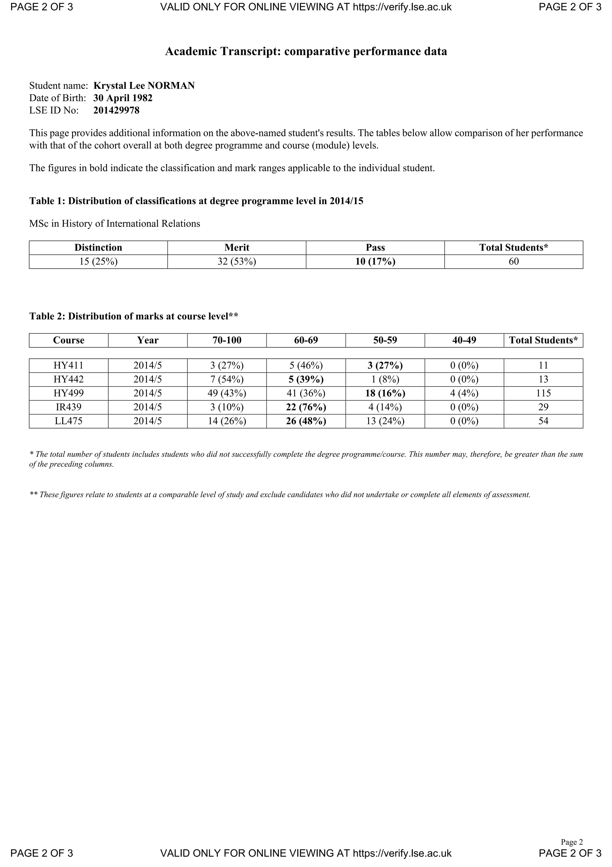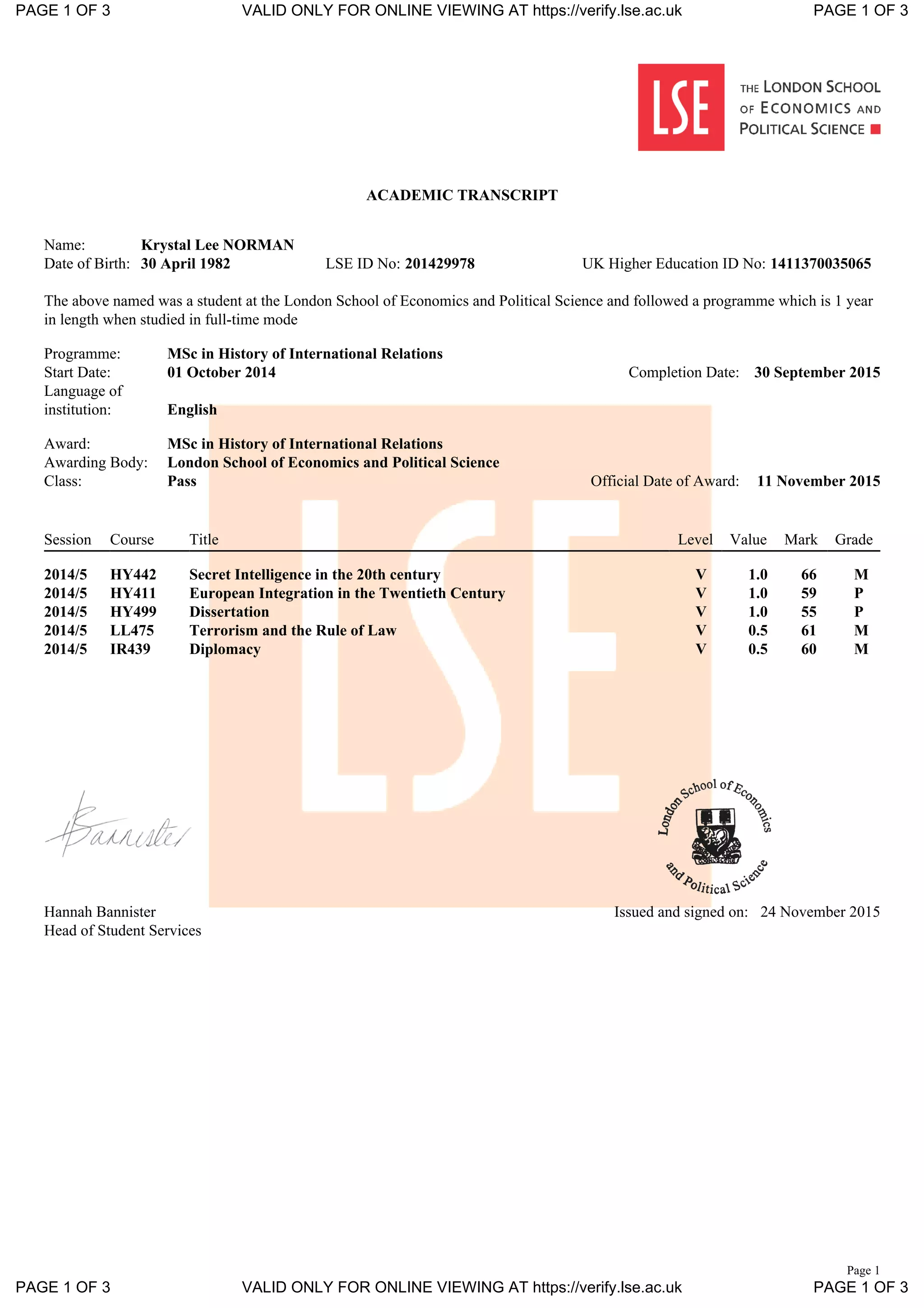 Krystal Lee Norman attended the London School of Economics and Political Science from 2014-2015, where she earned an MSc in History of International Relations. Her academic transcript shows that she received marks of 66, 59, and 55 for courses in secret intelligence, European integration, and her dissertation respectively, earning a 'Pass' grade. Additional data compares her performance to others in her program and courses.