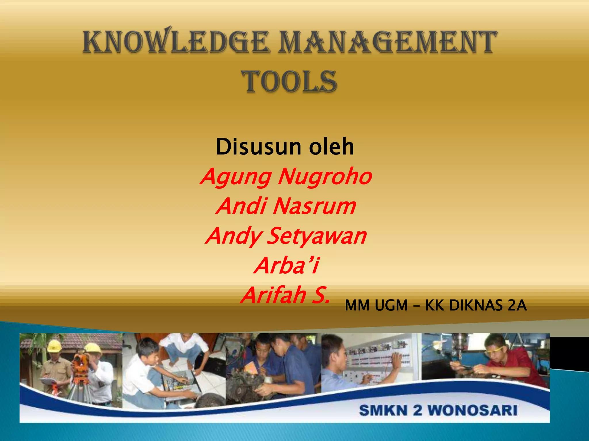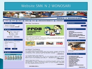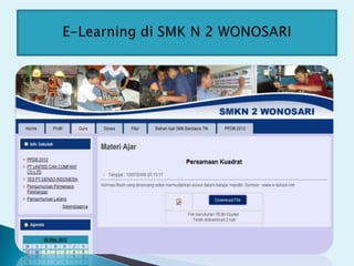 Dokumen ini membahas tentang manajemen pengetahuan yang mencakup pendekatan sistemik untuk meningkatkan efisiensi organisasi melalui penciptaan, berbagi, dan transfer pengetahuan. E-learning dijelaskan sebagai metode pembelajaran jarak jauh yang memanfaatkan teknologi untuk memungkinkan siswa belajar secara mandiri tanpa harus berada di kelas. Terdapat contoh penerapan manajemen pengetahuan dalam konteks sekolah yang menggunakan web untuk transfer informasi kepada siswa.