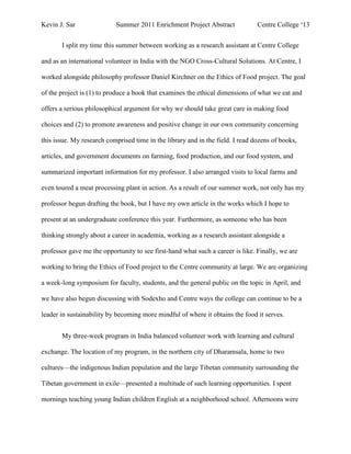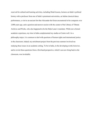 The student spent their summer working as a research assistant with a philosophy professor on a book examining the ethics of food and food choices. Their research involved reading books and documents on farming and food systems and arranging visits to local farms. As a result, the professor has begun drafting the book and the student has written an article. The student also volunteered in India with an NGO, teaching English and participating in cultural activities. While not formal academics, the experience complemented their philosophy studies by allowing them to consider questions of human rights and justice from a first-hand perspective.
