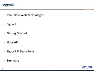 The document discusses SignalR, an ASP.NET library that facilitates real-time web functionalities for applications. It covers topics such as real-time web technologies, the setup and use of SignalR with SharePoint, and highlights features like hubs for remote procedure calls. It emphasizes the ability to push data to clients and manage connections efficiently.
