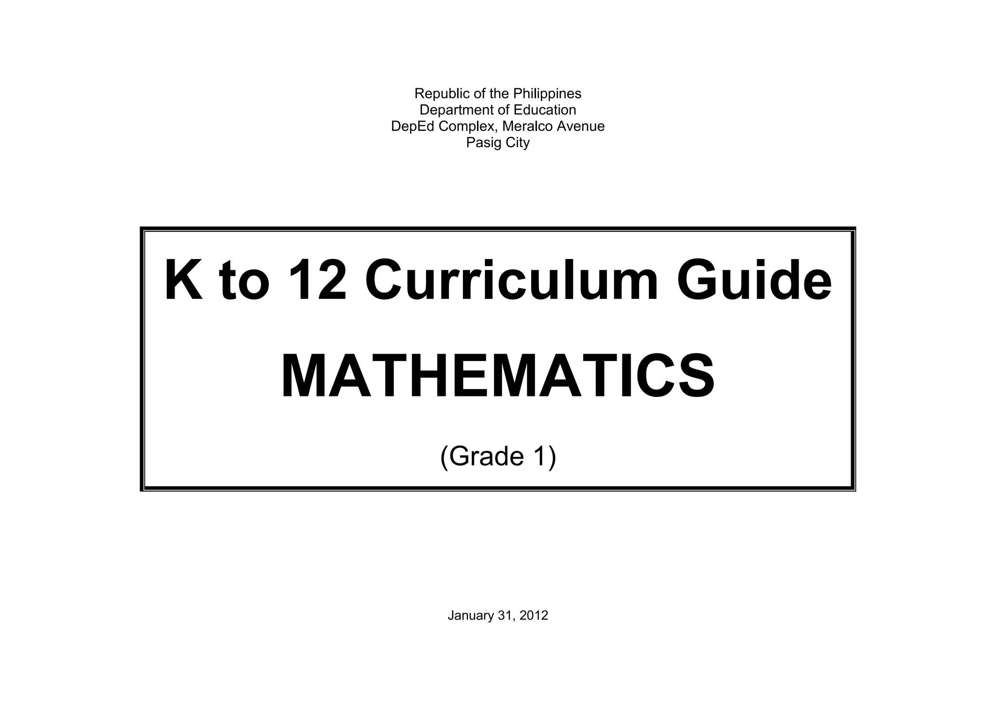 The document provides an overview of the K to 12 Mathematics curriculum guide for grade 1 in the Philippines. It discusses the conceptual framework, which identifies critical thinking and problem solving as the twin goals of mathematics education. It also outlines the five content areas - numbers and number sense, measurement, geometry, patterns and algebra, and probability and statistics. The guide is grounded in learning principles like experiential learning, reflective learning, constructivism, cooperative learning, and discovery-based learning.