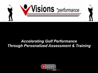 This document outlines an agenda for a K-VEST TPI 3D Golf Seminar focused on accelerating golf performance through personalized assessment and training. The seminar will discuss the differences between swing style and efficiency, with efficiency being better measured through 3D technology. It will also cover the science of power and accuracy, improving mechanics from the ground up, golf-specific assessment and conditioning screens, and using video, 3D and real-time feedback with K-VEST TPI 3D graphs to improve a golfer's swing.