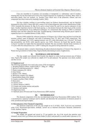 The study examines the physio-chemical properties of Gwarmi clay deposit in Wurno, Sokoto State, Nigeria, revealing its chemical composition and physical characteristics. The clay is rich in silica, alumina, and iron oxides, indicating its suitability for use as refractory materials and in load-bearing structures. Key findings include low firing shrinkage, high water absorption, and adequate thermal shock resistance, categorizing it as a kaolinic fireclay deposit.
